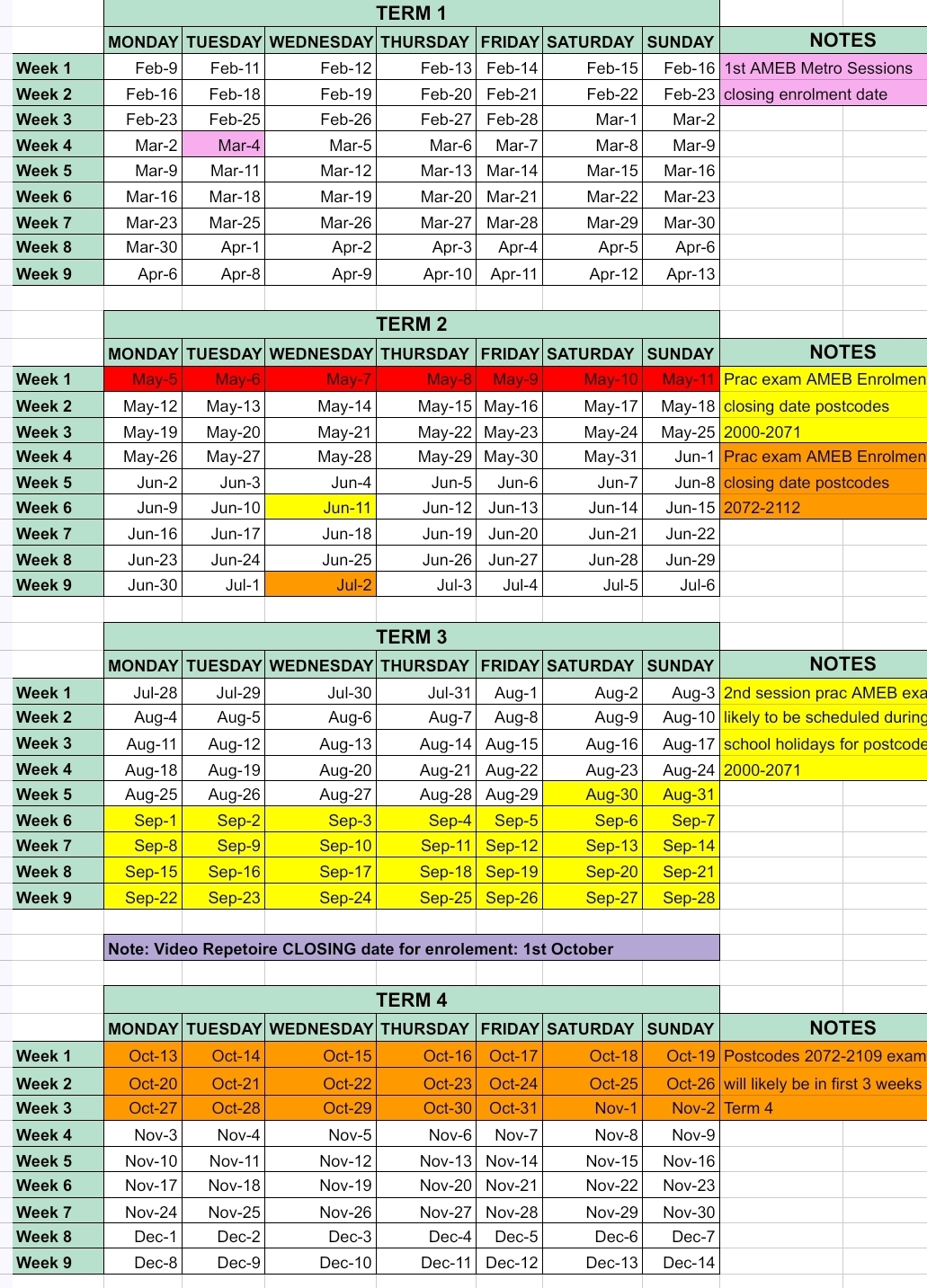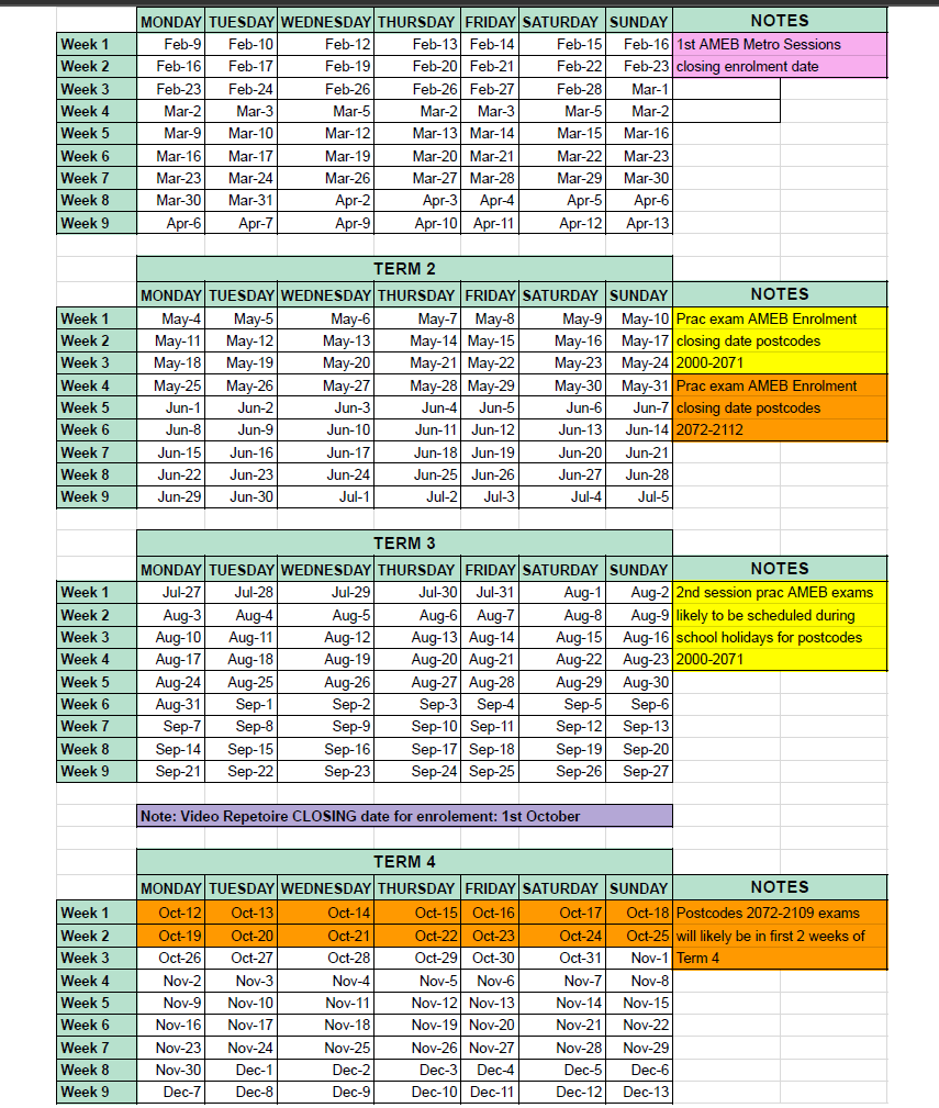 | Note: | Jun-11 | Prac exam AMEB Enrolment Closing date | |||||